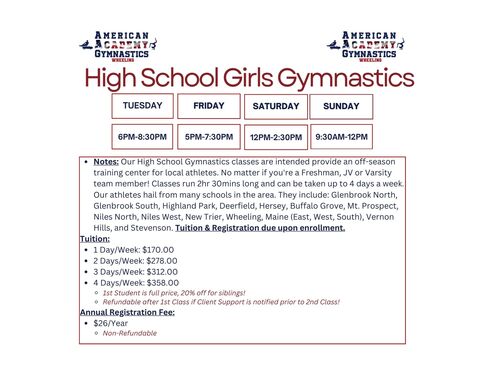 Listed below are the current class schedules for our High School Gymnastics Classes. If you're interested in registering or have any scheduling related questions, please click here to contact us or give us a call!