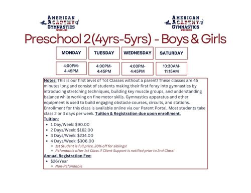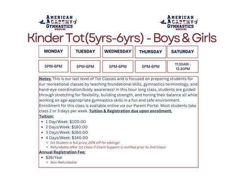 Listed below are the current class schedules for our Tot Gymnastics Classes. If you're interested in registering or have any scheduling related questions, please