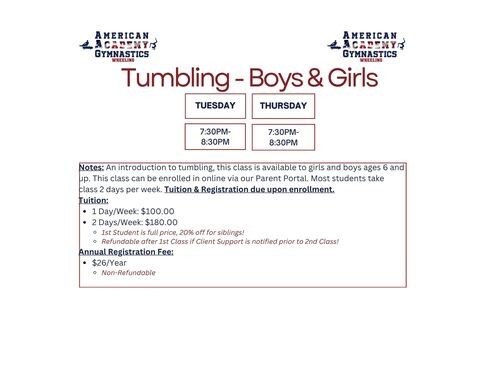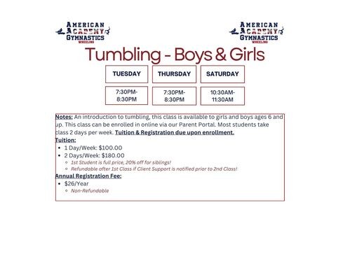 Listed below is the current class schedule for our Tumbling Class. If you're interested in registering or have any scheduling related questions, please